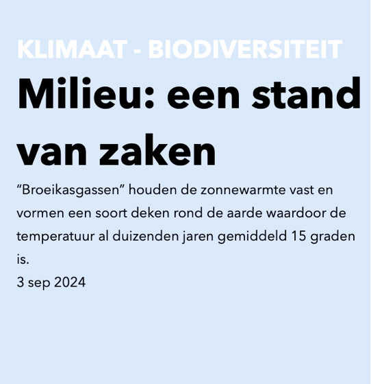 Voor de artikelen werd informatie gebruikt uit rapporten van United Nation Environment Programme (UNEP); U.N. Framework Convention on Climate Change (UNFCCC); IPCC; International Maritime Organisation; Food and Agriculture Organasition (FAO); EU Commissie; European Environment Agency; NASA; International Energy Agency; REN21; International Renewable Energy Agency (IRENA); Forest 500; FOD e.a.